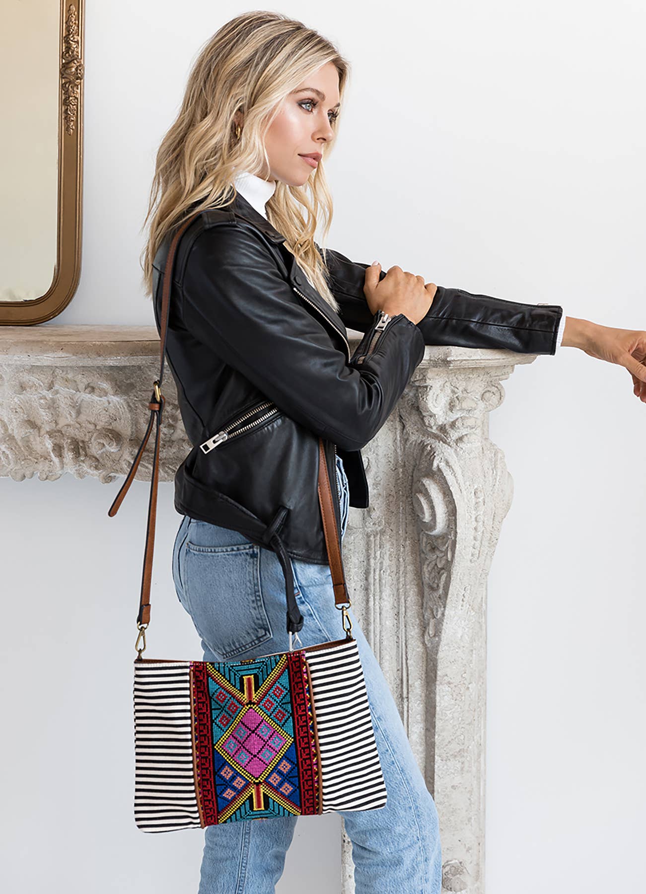 Add a pop of flair to your outfit with the Felicity Aztec Embroidered Crossbody in Black. Featuring vibrant Aztec embroidery on a sleek black canvas, this bag packs personality without sacrificing practicality. Its compact size keeps your essentials close while hands-free straps let you dance through your day with ease. Perfect for adventures big and small, it’s the playful twist your wardrobe didn’t know it needed.